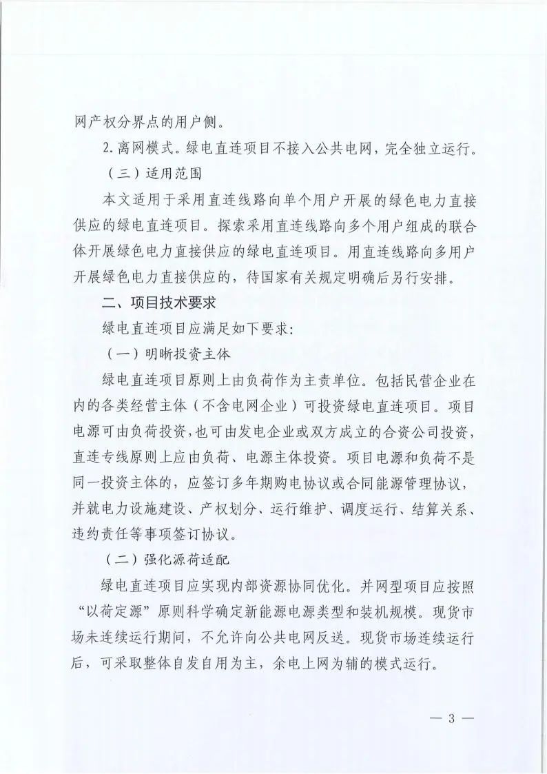 第一部分為“項(xiàng)目類型及適用范圍”。主要明確新增負(fù)荷、擁有自備電廠的存量負(fù)荷、有剛性需求的出口型企業(yè)、尚未開展電網(wǎng)接入工程建設(shè)或因新能源消納受限等原因無法并網(wǎng)的新能源項(xiàng)目可開展綠電直連。