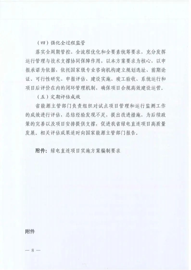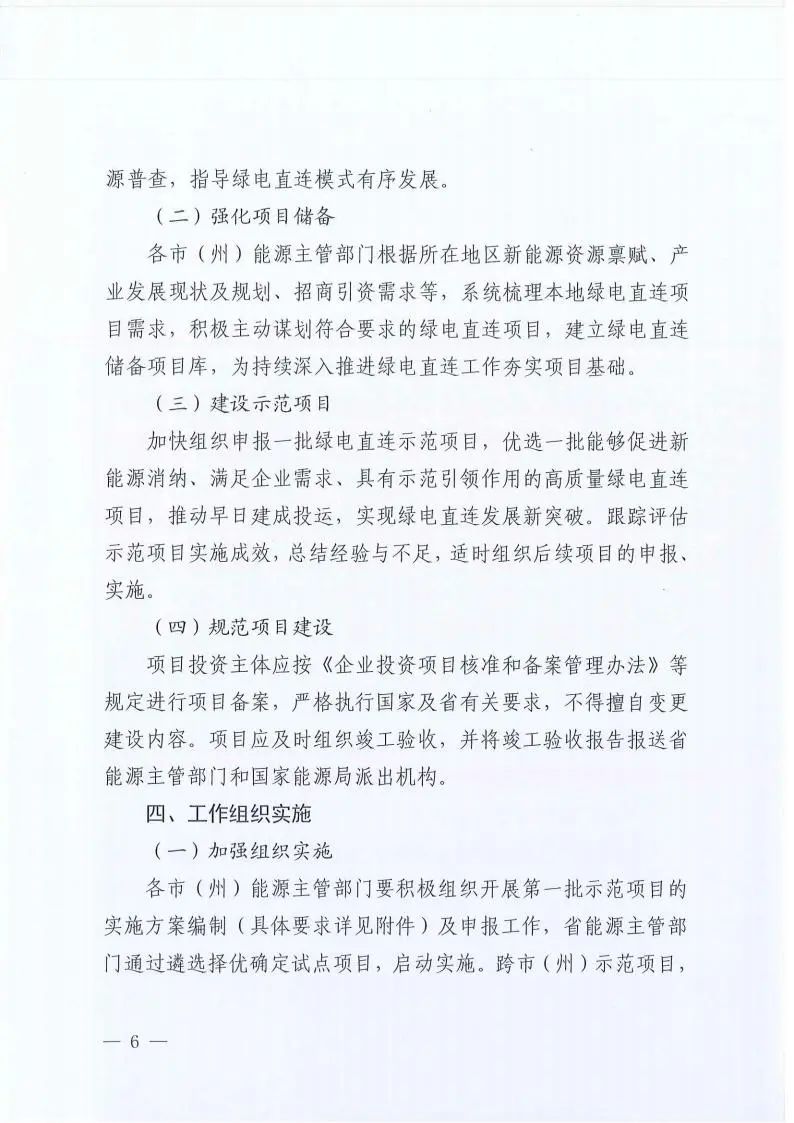 第四部分為“工作組織實(shí)施”。提出加強(qiáng)組織實(shí)施、強(qiáng)化政策支持、壓實(shí)主體責(zé)任、強(qiáng)化全過程監(jiān)管、定期評(píng)估成效等措施,確保方案落地實(shí)施,為做好綠電直連工作提供保障和支撐。