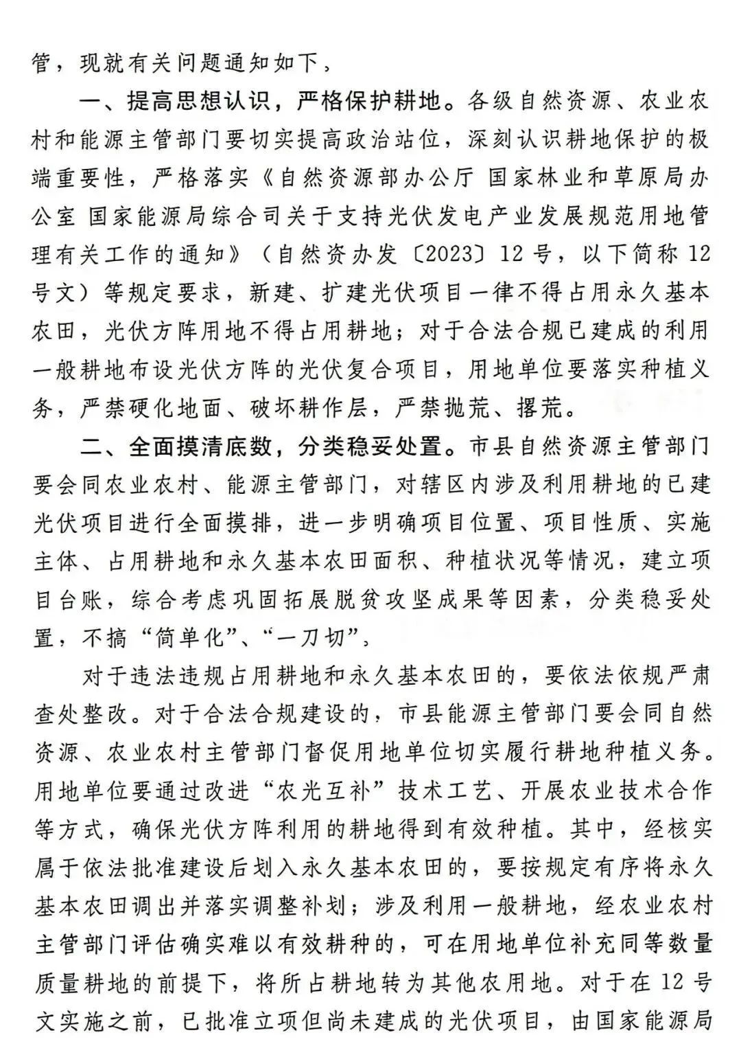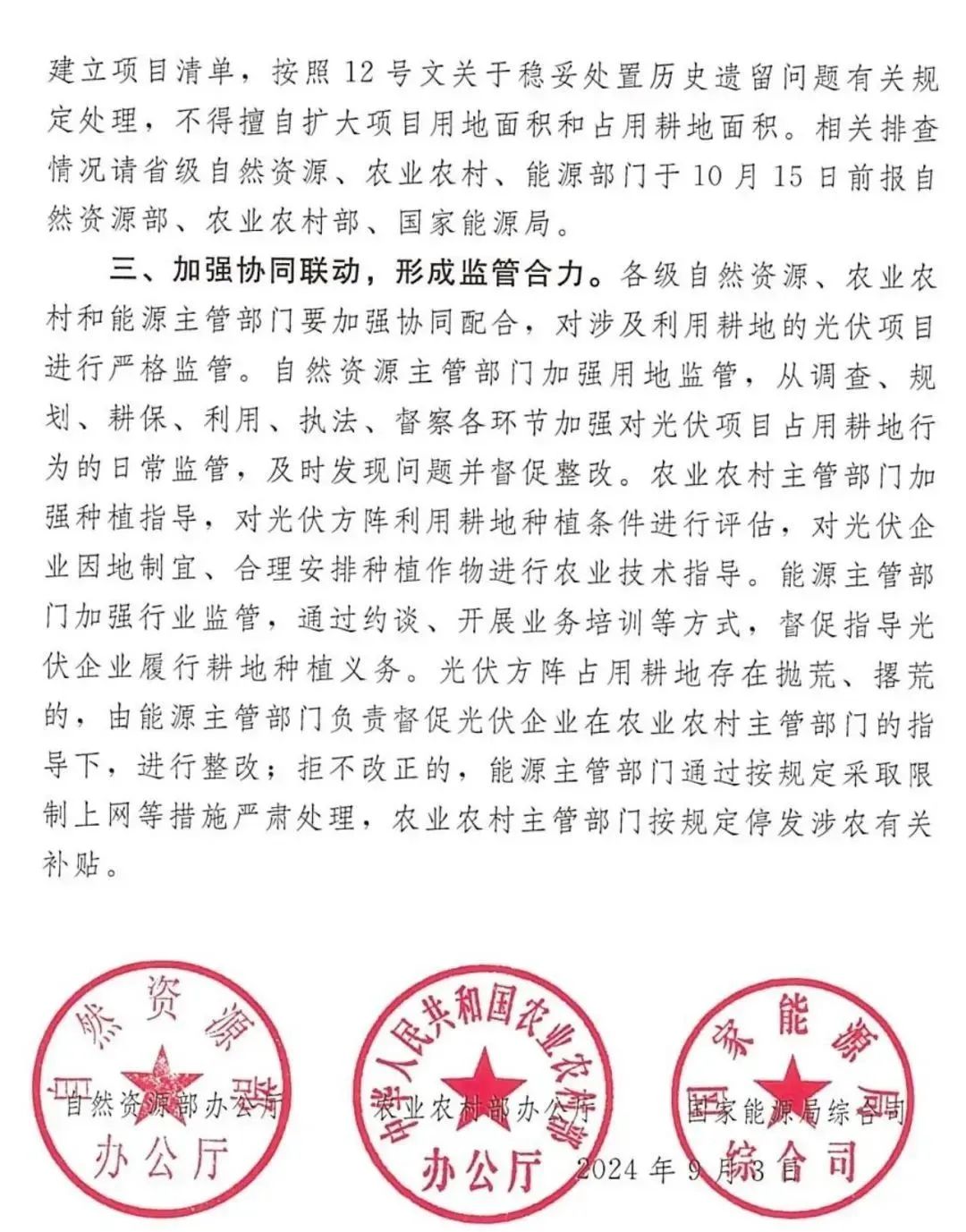 2024年9月,自然資源部、農(nóng)業(yè)農(nóng)村部、國家能源局聯(lián)合發(fā)布《關(guān)于進(jìn)一步規(guī)范光伏項(xiàng)目利用耕地有關(guān)問題的通知》,該文件于日前獲得公開。