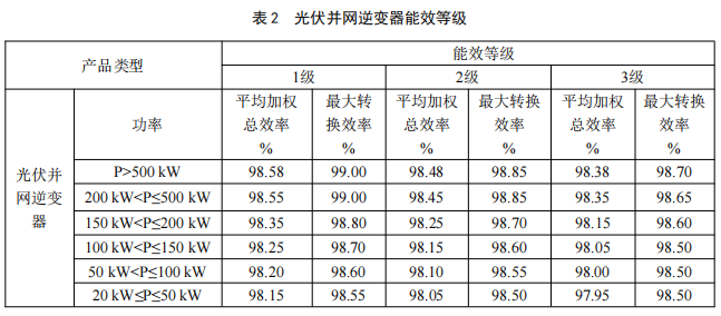 光伏并網(wǎng)逆變器能效限定值為表2中能效等級(jí)的3級(jí)。