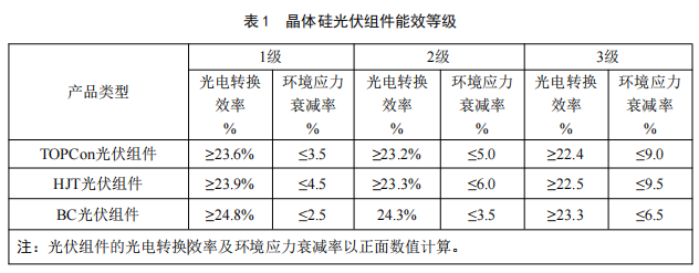 晶體硅光伏組件能效限定值為表1中能效等級(jí)的3級(jí)。